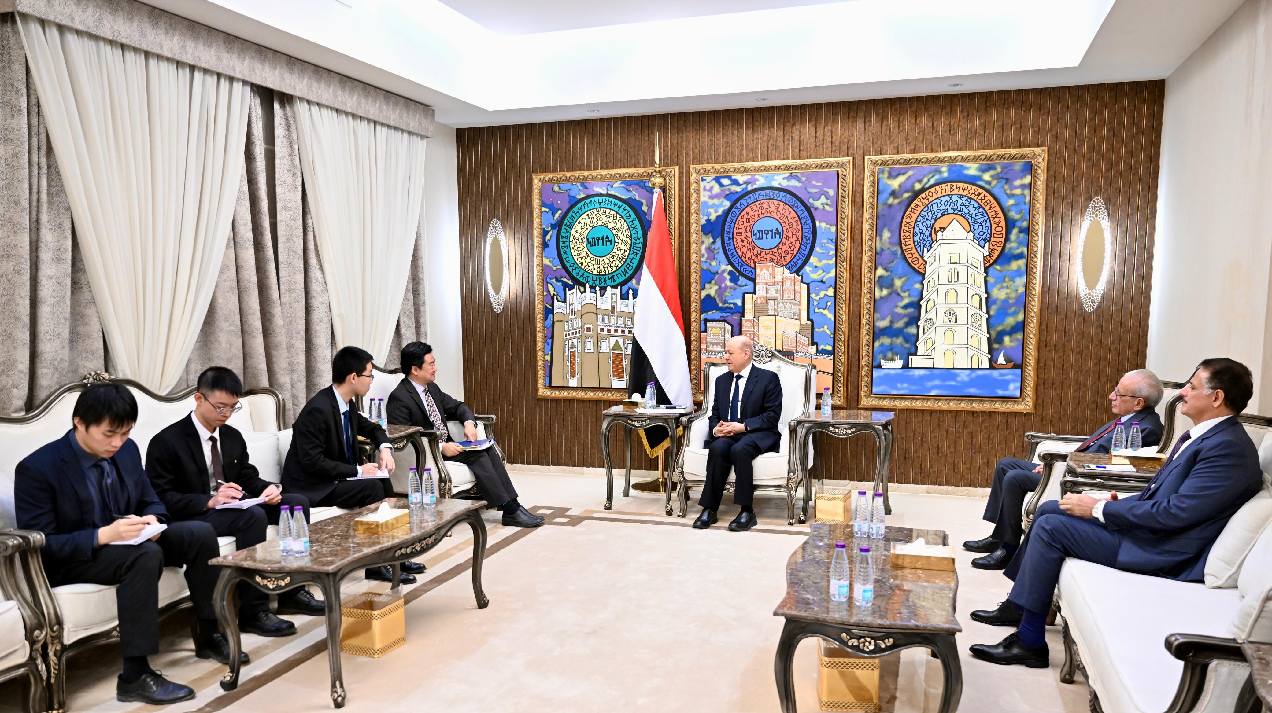 His Excellency Dr. Rashad Mohammed al-Alimi, the Chairman of the Presidential Leadership Council, received Wednesday the Chargé d’Affaires of the Embassy of the People’s Republic of China to Yemen Zhao Cheng.
