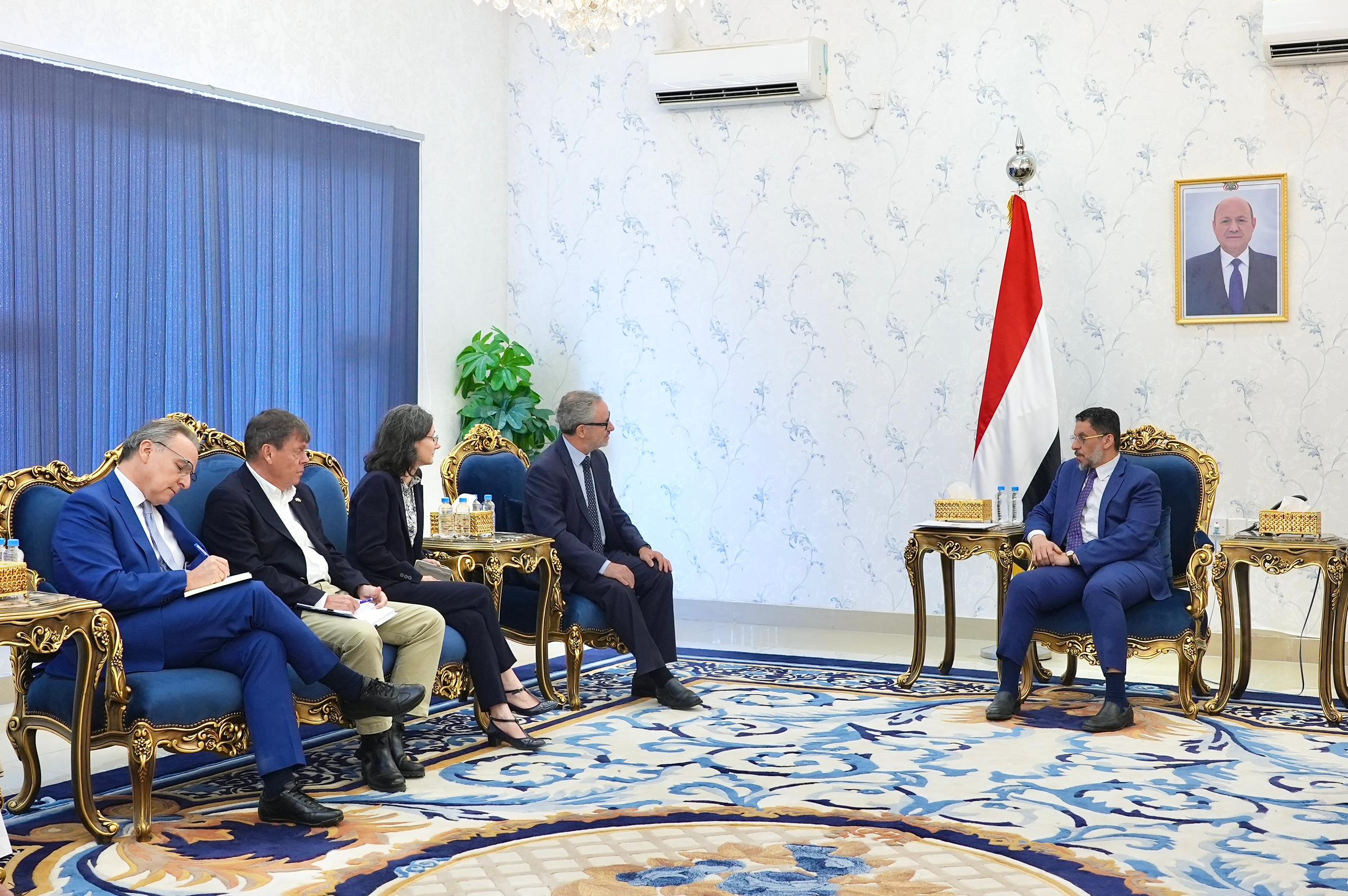واستعرض الاجتماع، بمشاركة سفراء فرنسا، المانيا، هولندا، رومانيا، واليونان، الدعم الأوروبي والدولي المطلوب لإسناد الجهود الحكومية من اجل تعزيز موقف العملة الوطنية، واحتواء تداعيات توقف الصادرات النفطية، وارتفاع اسعار الشحن البحري على الاوضاع المعيشية جراء الهجمات الارهابية الحوثية على السفن التجارية والملاحة الدولية.