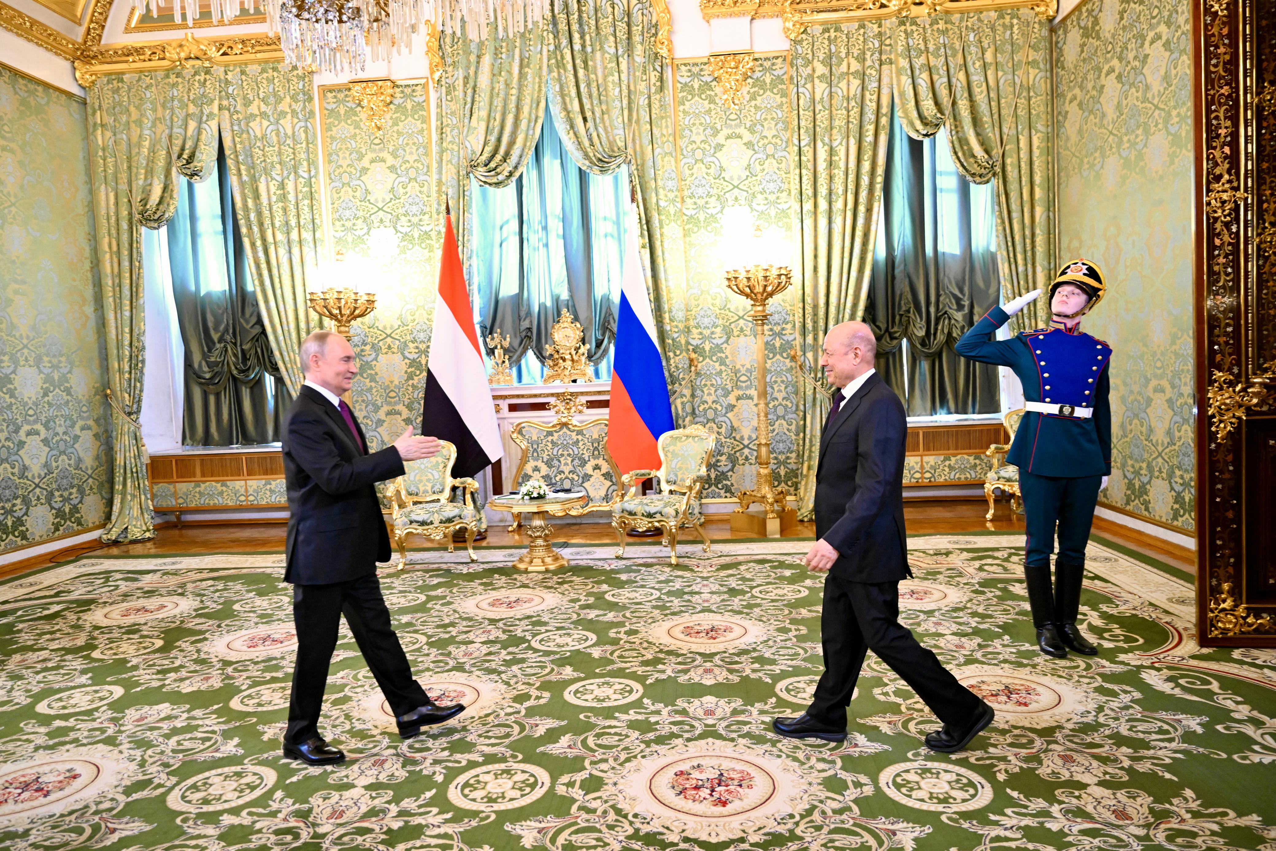 وفي اللقاء، رحب الرئيس الروسي برئيس مجلس القيادة الرئاسي، والوفد المرافق له، مجددا تأكيد التزام روسيا الاتحادية بدعم اليمن وشعبه، وتطلعاته في الامن والاستقرار والسلام بما يجسد العلاقات التاريخية المتينة بين البلدين، التي تعتمد على تقاليد راسخة من الصداقة، والاحترام المتبادل.