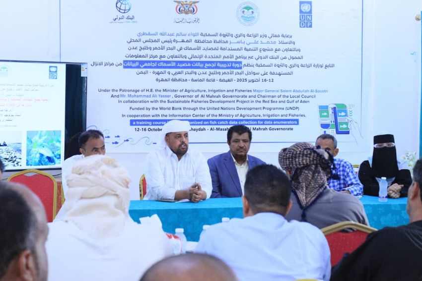 دشن الأمين العام للمجلس المحلي بمحافظة المهرة، سالم نيمر، اليوم، الدورة التدريبية المتخصصة في جمع بيانات مصيد الأسماك لطاقم جامعي البيانات، وذلك ضمن أنشطة مشروع التنمية المستدامة للمحافظة.