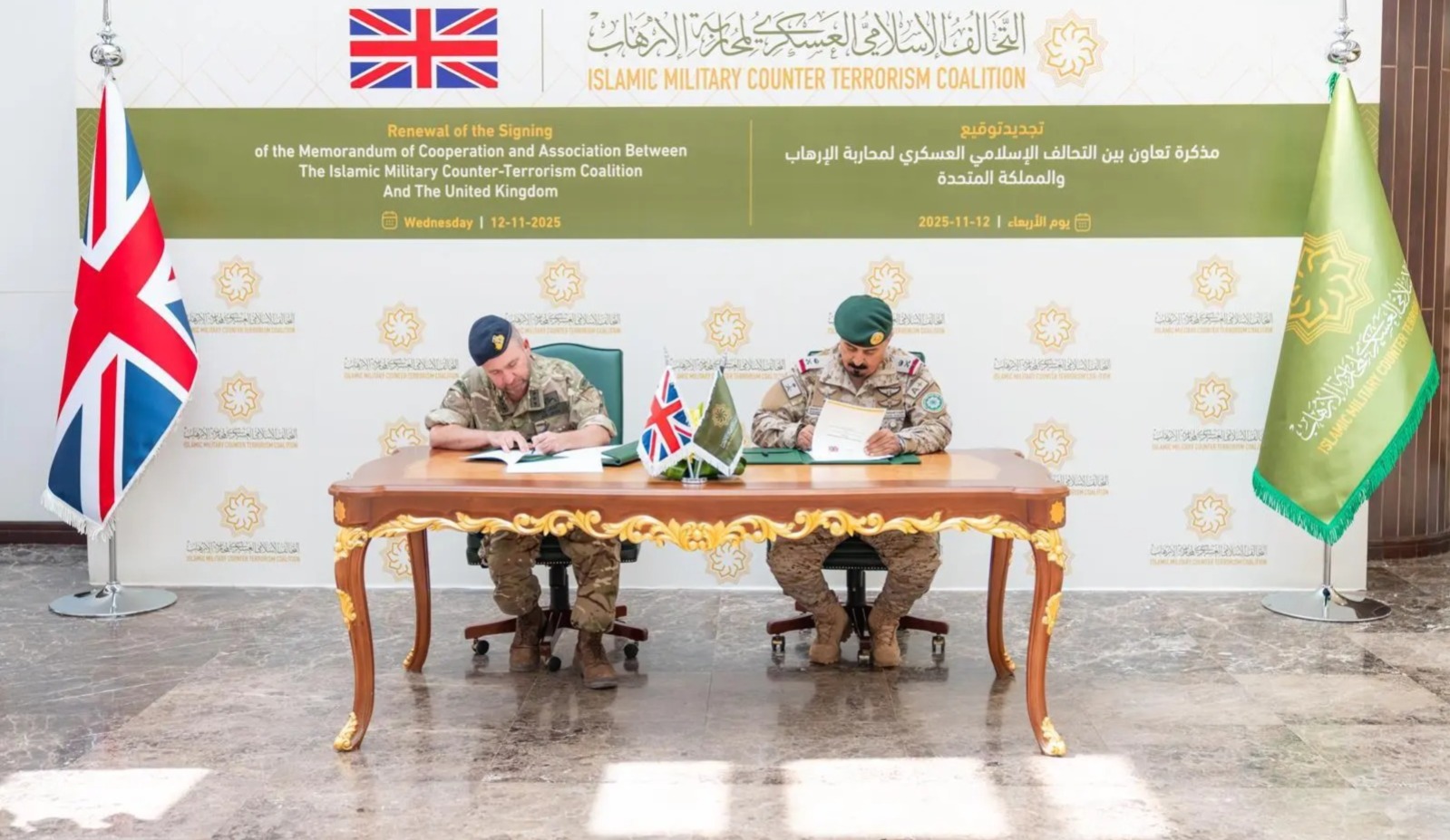 وقع التحالف الإسلامي العسكري لمحاربة الإرهاب، اليوم، مذكرة تعاون مشترك مع حكومة المملكة المتحدة، والتي تهدف إلى بناء ودعم التعاون بين الجانبين في مجالات محاربة الإرهاب والتطرف لا سيّما في المجالات الأربعة (الفكري، والإعلامي، ومحاربة تمويل الإرهاب, والمجال العسكري).