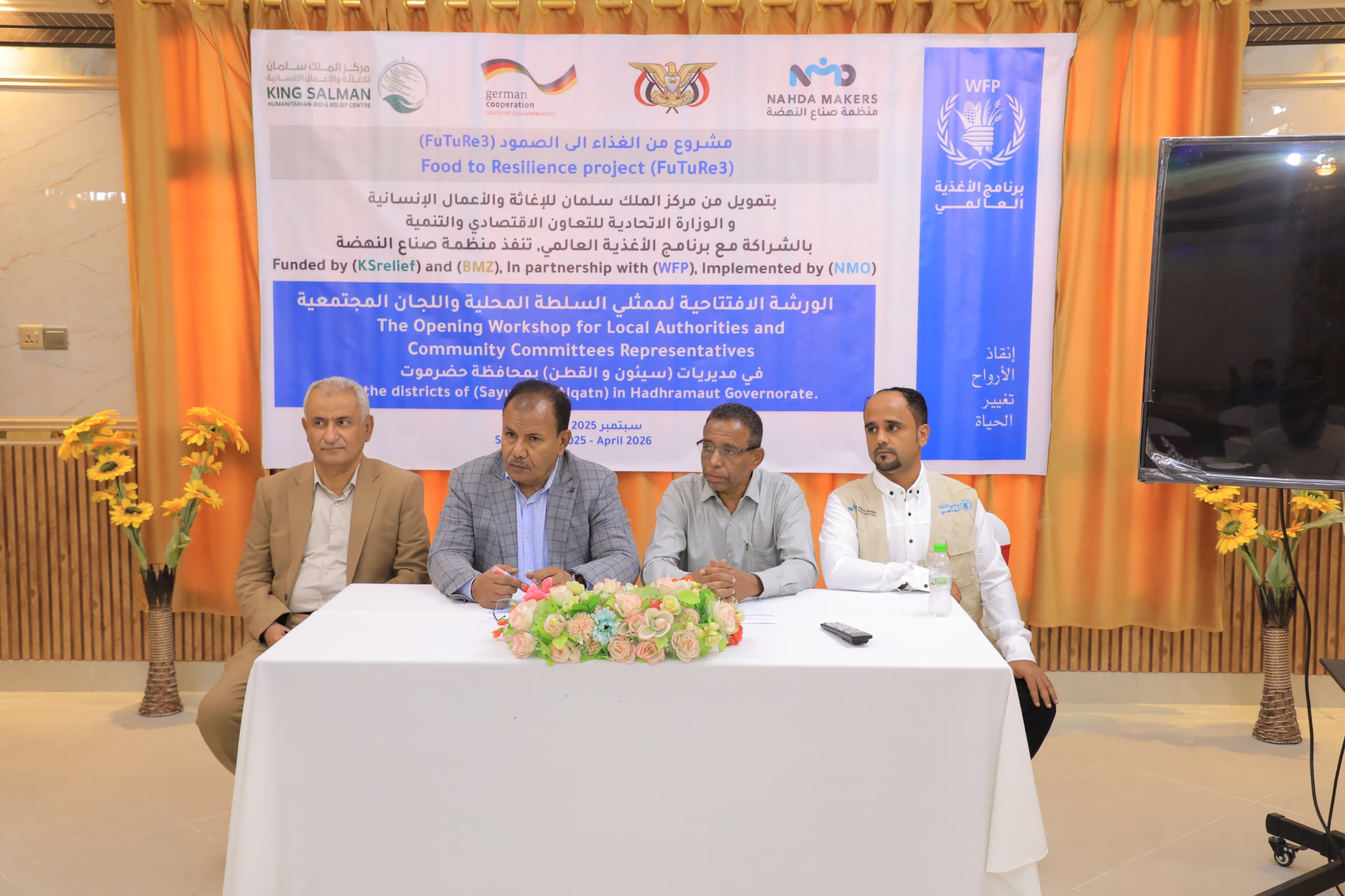 عقدت بمدينة سيئون محافظة حضرموت، اليوم ، الورشة الافتتاحية لممثلي السلطة المحلية واللجان المجتمعية بمديريتي سيئون والقطن، ضمن أنشطة مشروع "من الغذاء إلى الصمود" (FutuRe3)، والممول من مركز الملك سلمان للإغاثة والأعمال الإنسانية، وتنفيذ مؤسسة صناع النهضة.