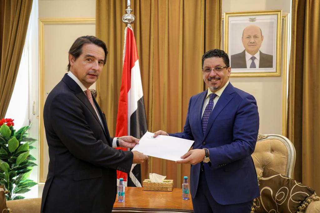 تسلم وزير الخارجية وشؤون المغتربين الدكتور احمد عوض بن مبارك اليوم نسخ من أوراق اعتماد سفيرة الدنمارك ليز الوته بليز وسفير البرتغال لدى اليمن نونو ماتياس.