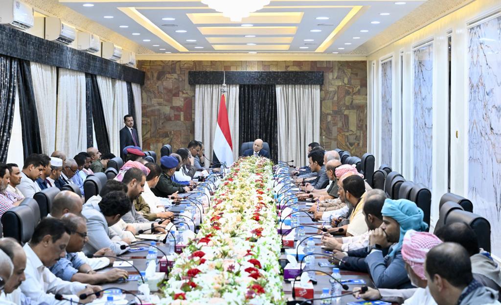 وشدد رئيس مجلس القيادة الرئاسي خلال الاجتماع على المسؤوليات المشتركة لاجهزة الدولة في ادراك الظروف الاستثنائية المرتبطة بانقلاب المليشيات الحوثية، والعمل المضاعف للحد من تداعيات استمرار سيطرتها على مؤسسات الدولة الشرعية، وانتهاكاتها الجسيمة للقانون الدولي الانساني.