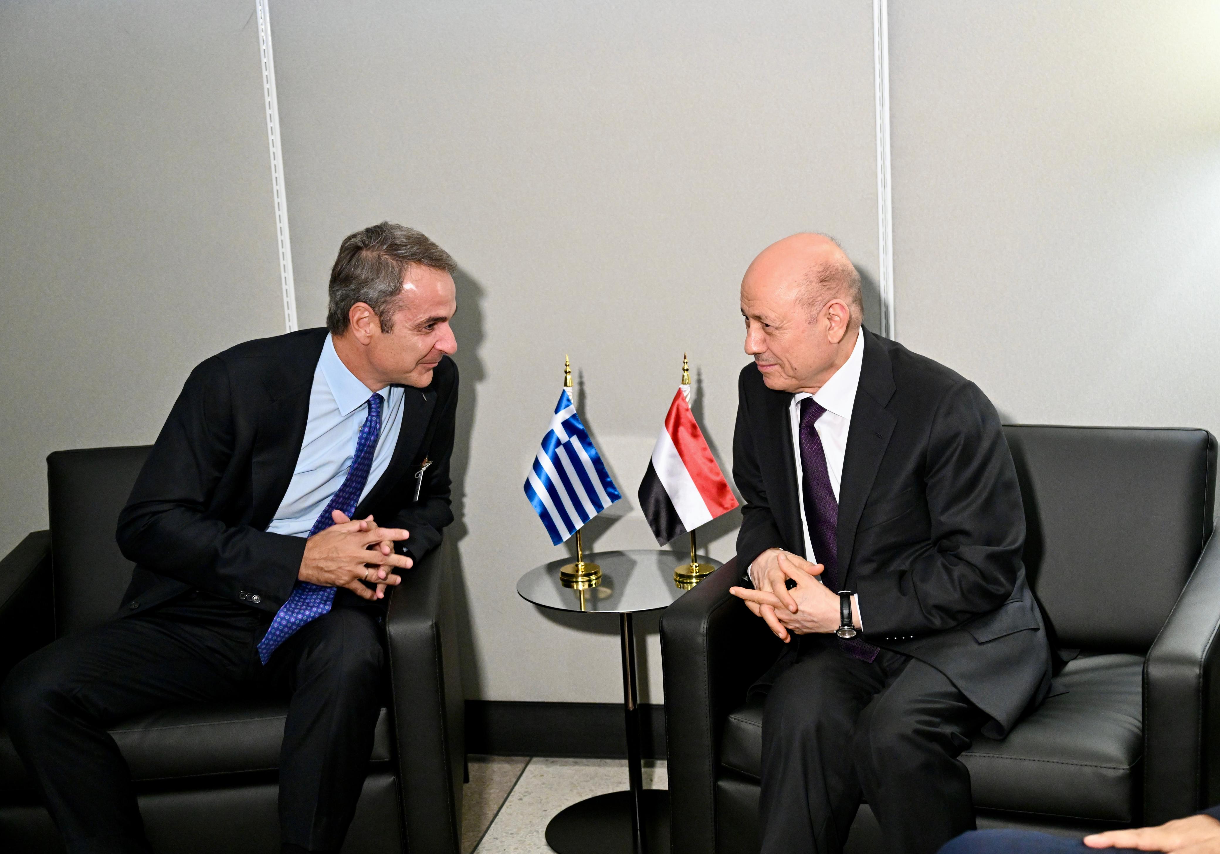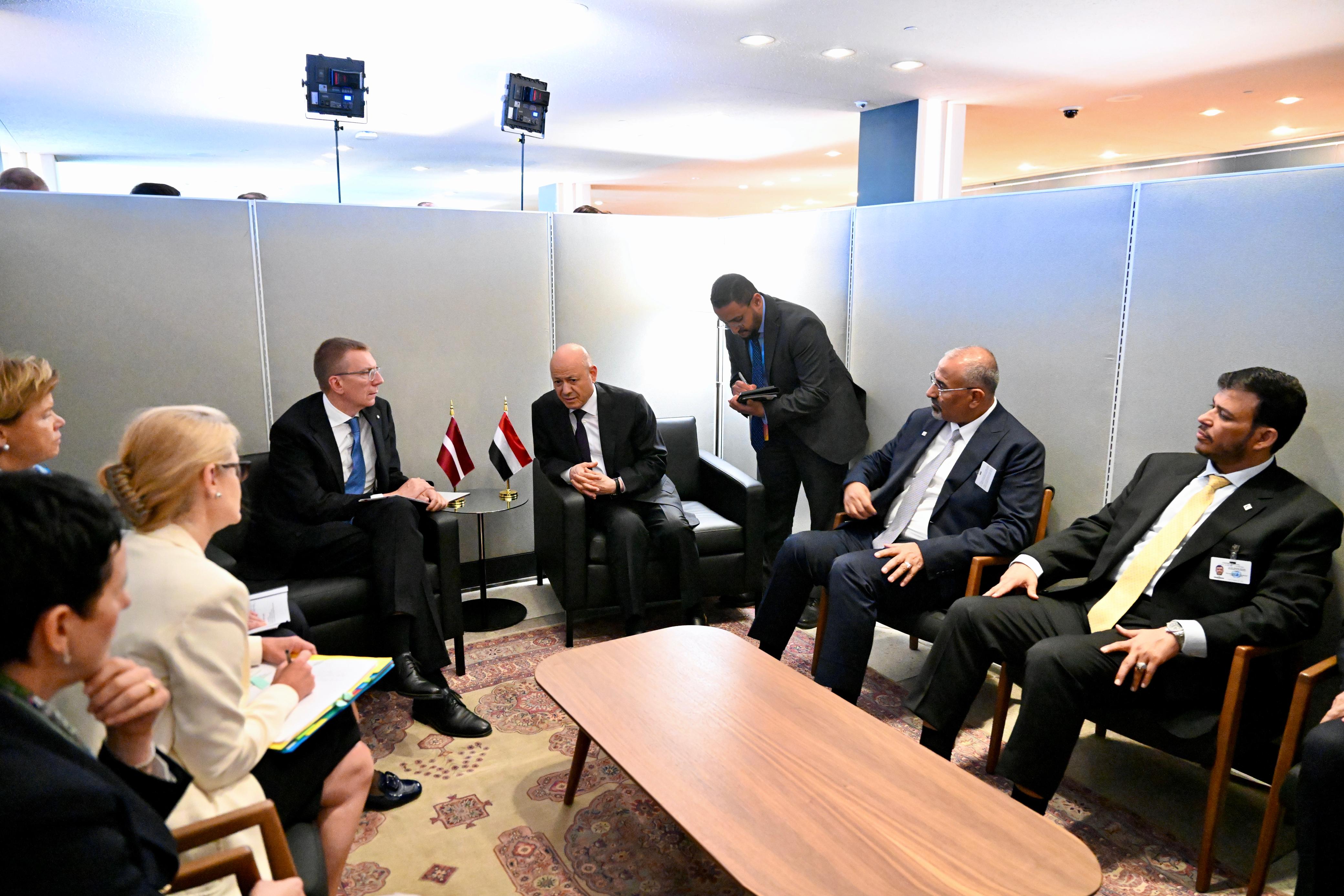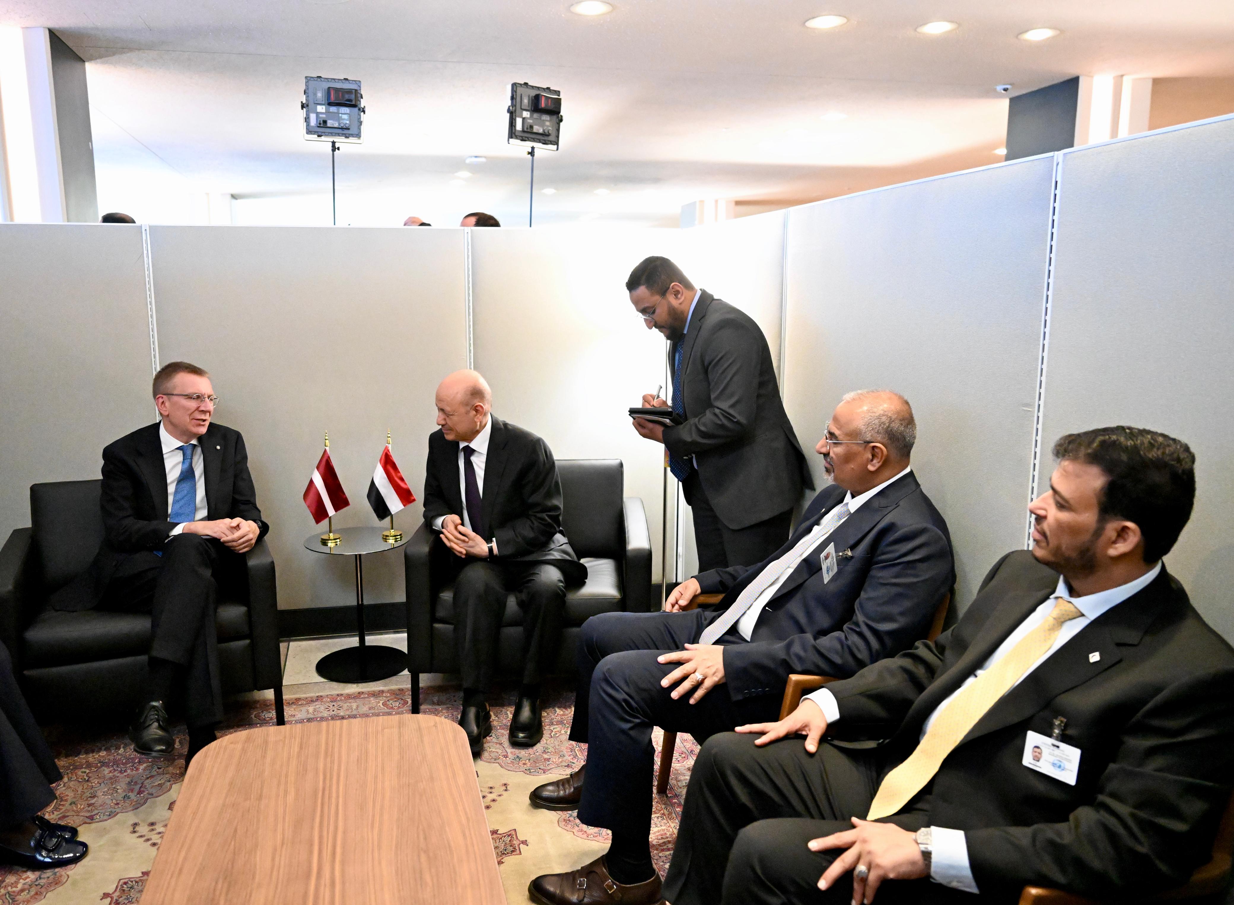 Chairman of the Presidential Leadership Council Dr. Rashad al-Alimi, along with Council members Major General Aidaroos al-Zubaidi and Dr. Abdullah al-Alimi, met Tuesday with President Edgar Rinkevich, President of the Republic of Latvia, on the sidelines of the United Nations General Assembly meetings.