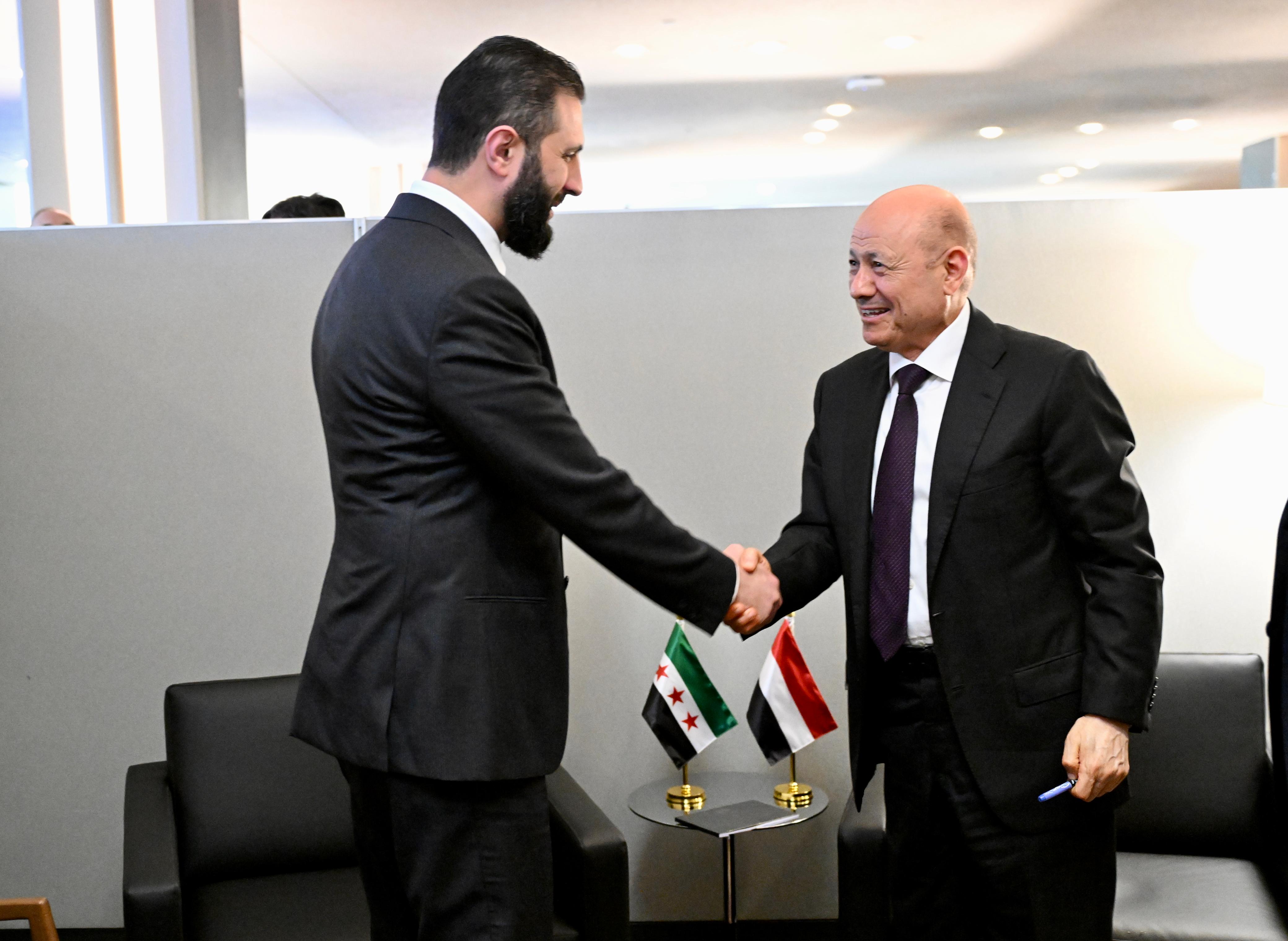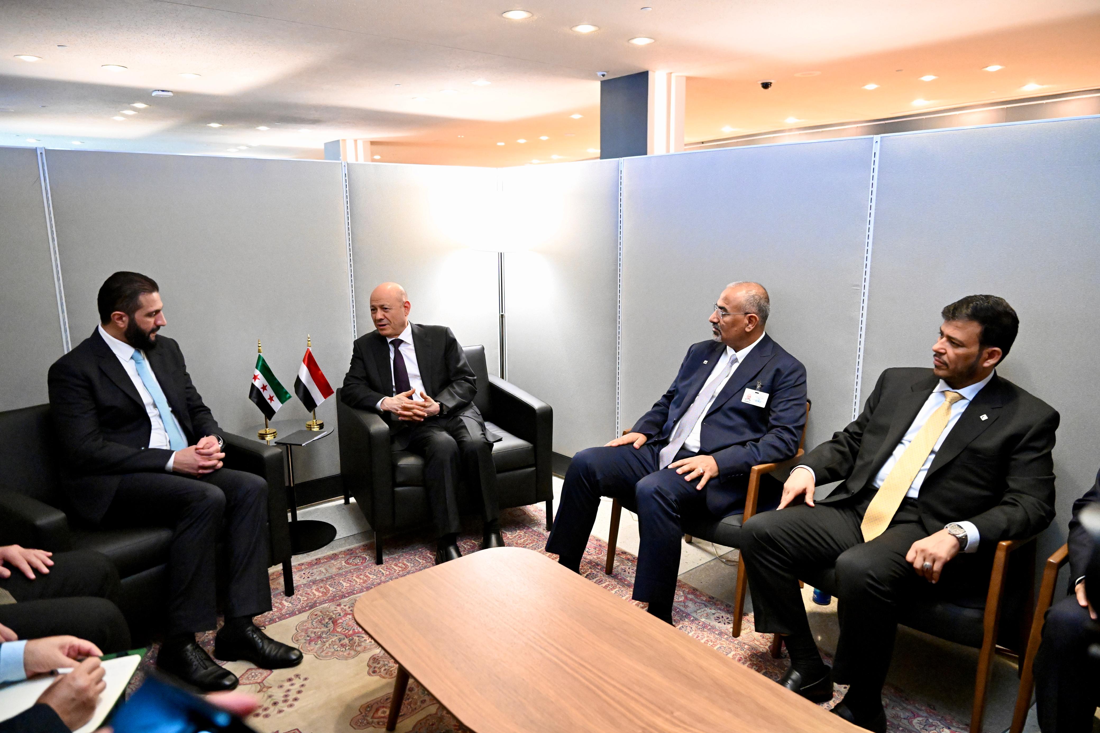 Chairman of the Presidential Leadership Council Dr. Rashad al-Alimi, along with Council members Major General Aidaroos al-Zubaidi and Dr. Abdullah al-Alimi, met Tuesday with President Ahmed Al-Sharaa of the Syrian Arab Republic on the sidelines of the United Nations General Assembly meetings.