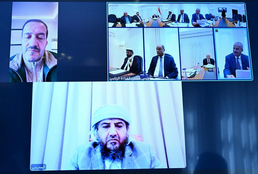 . The Presidential Leadership Council (PLC( held a meeting today, Sunday, chaired by His Excellency President Dr. Rashad al-Alimi, Chairman of the Council, with the attendance of its members Sultan al-Arada, Dr. Abdullah al-Alimi, and via video call Abdul-Rahman al-Mahrami and Othman Majli, while Aidaroos al-Zubaidi, Tariq Saleh and Faraj al-Bahsni were absent with an excuse.