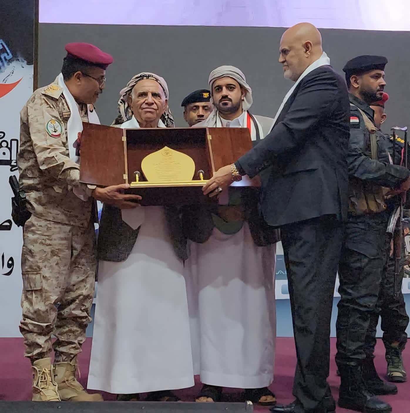 وسلم محافظ محافظة تعز ومعه أركان حرب محور تعز، اللواء عبدالعزيز المجيدي، درع الوفاء والواجب لوالد الشهيدة إفتهان المشهري تقديراً لدوره الوطني الكبير.