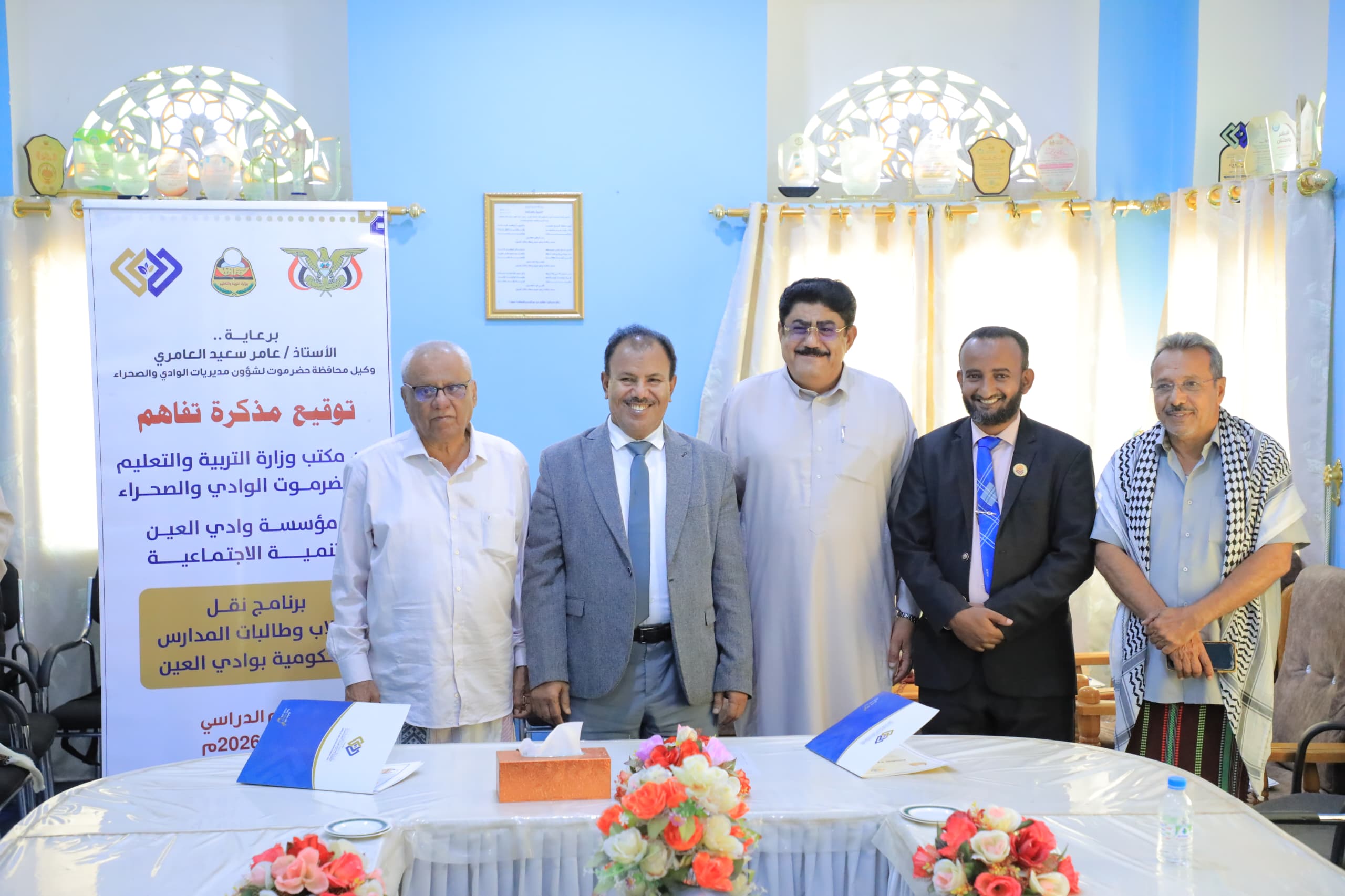 جرى اليوم، بمدينة سيئون، توقيع مذكرة تفاهم بين مكتب التربية والتعليم بوادي حضرموت والصحراء، ومؤسسة وادي العين للتنمية الاجتماعية، لتنفيذ برنامج نقل طلاب وطالبات المدارس الحكومية بمديرية وادي العين.