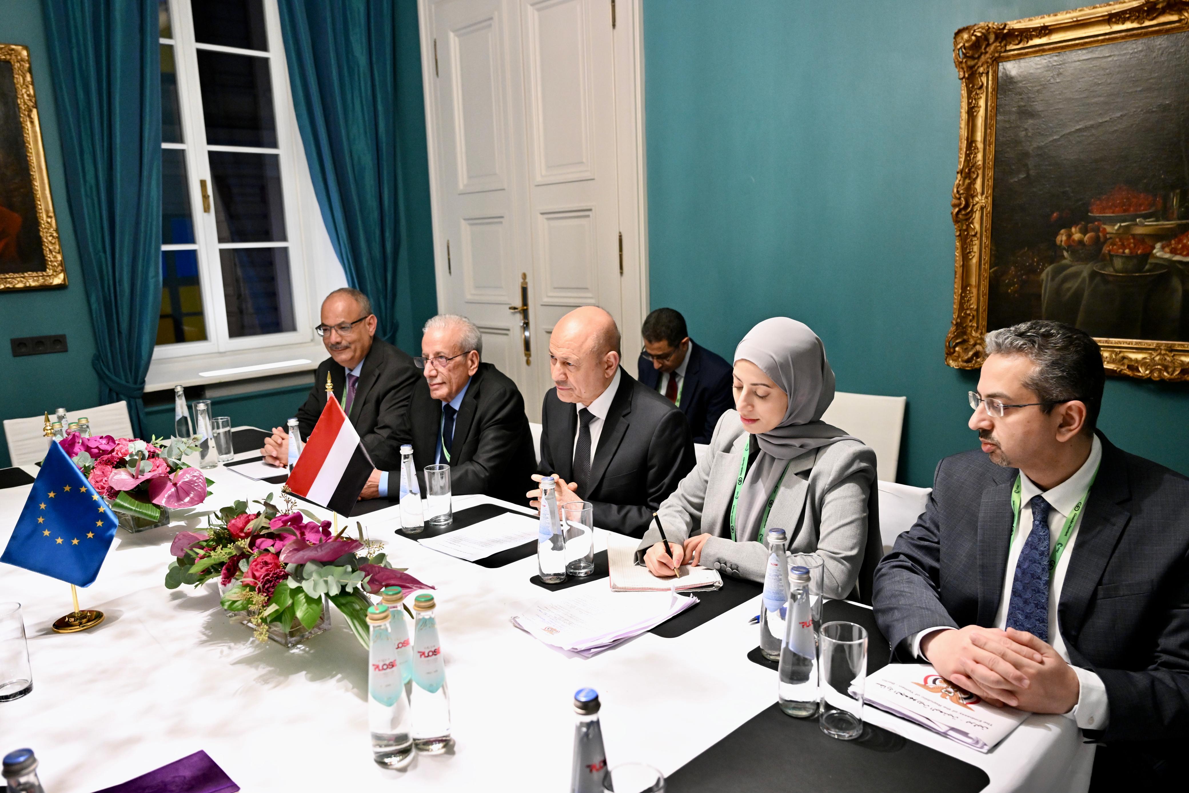 رئيس مجلس القيادة يدعو الاتحاد الأوروبي الى الانتقال من إدارة الأزمة إلى إنهاء التهديد الحوثي وتعزيز الشراكة الأمنية والاقتصادية