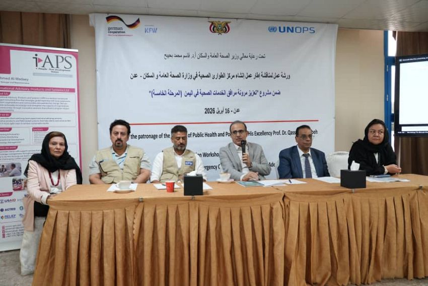 عقدت في العاصمة المؤقتة عدن، اليوم، ورشة عمل متخصصة لمناقشة إطار عمل إنشاء مركز عمليات طوارئ الصحة العامة في اليمن، وذلك ضمن مشروع تعزيز مرونة مرافق الخدمات الصحية (المرحلة الخامسة)، بدعم من بنك التنمية الالماني.