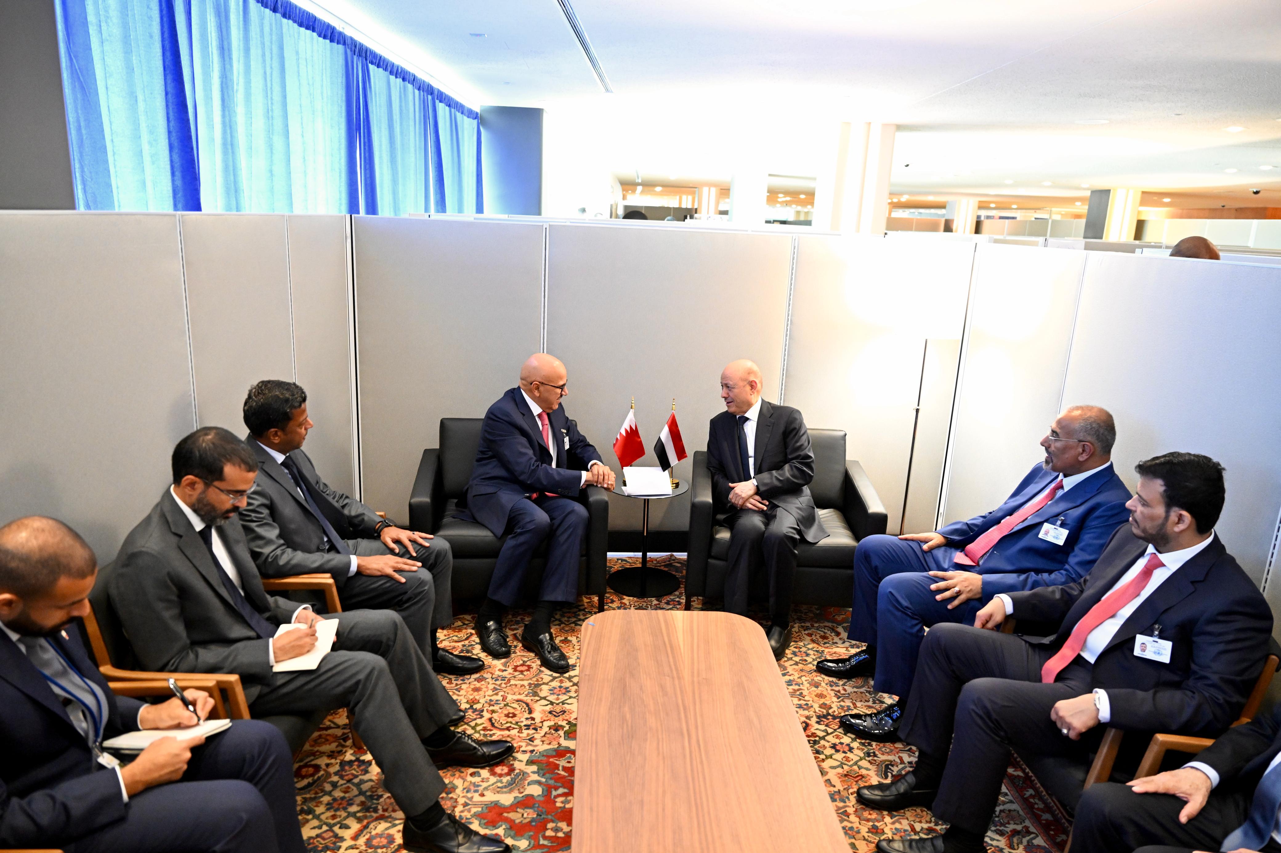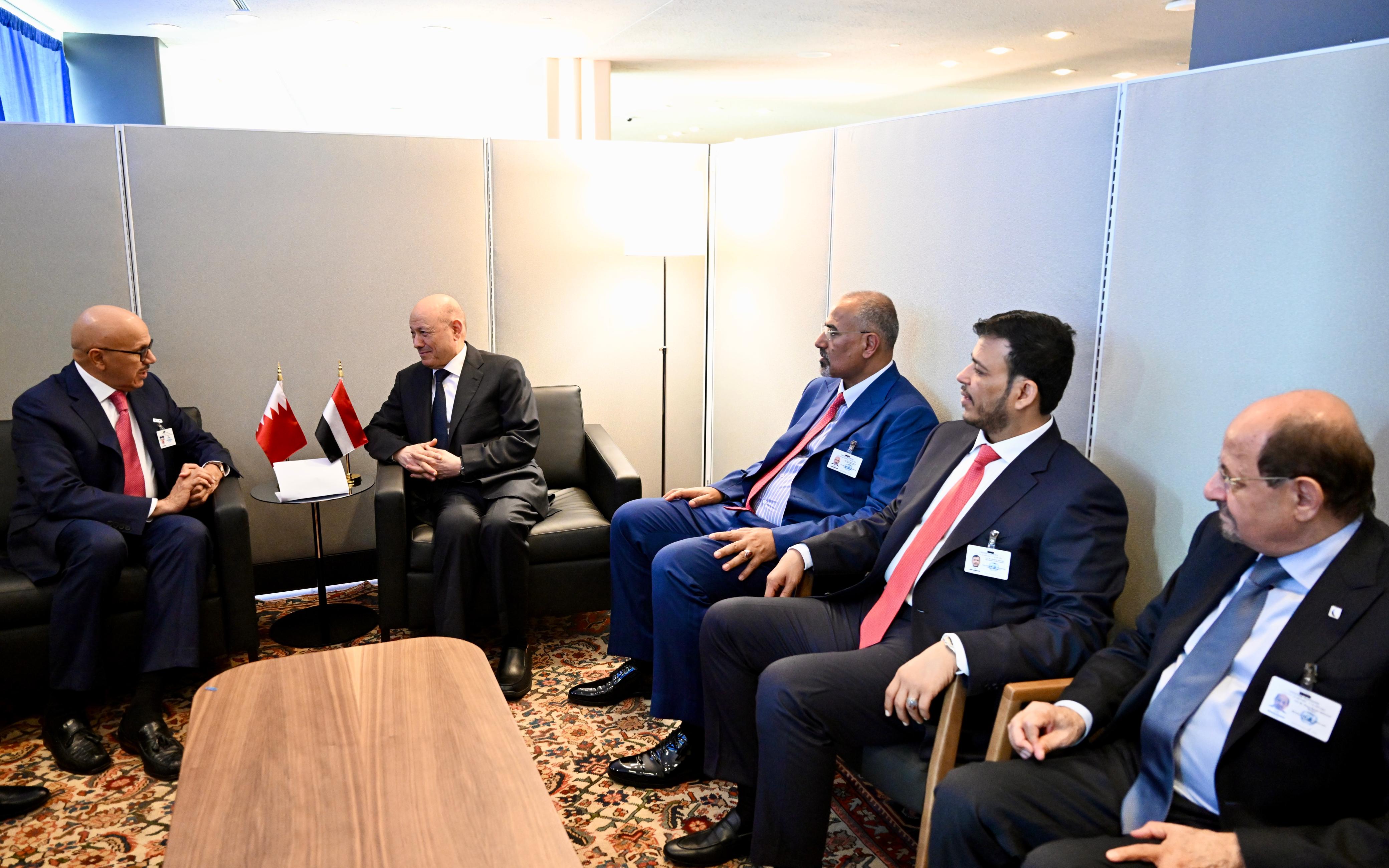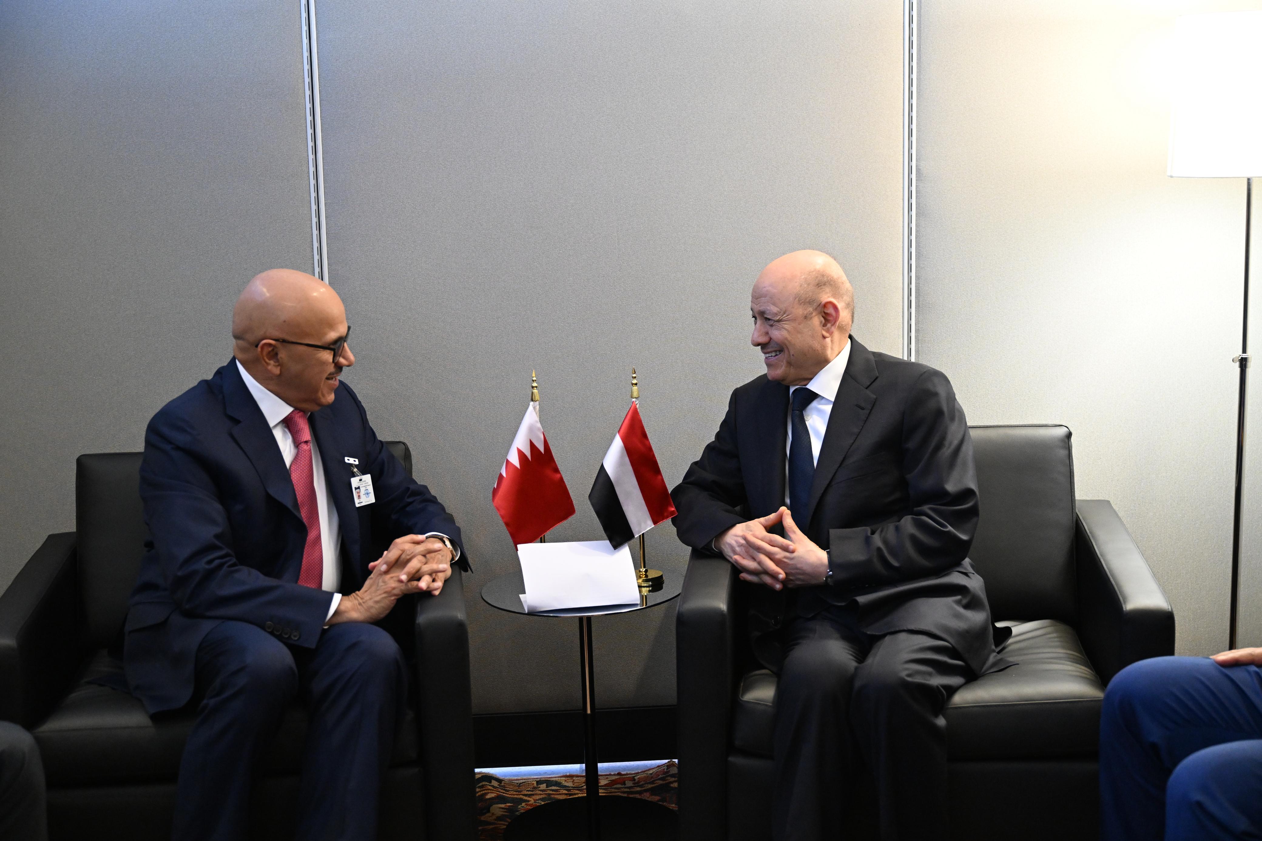 Chairman of the Presidential Leadership Council Dr. Rashad al-Alimi, along with Council members Major General Aidaroos al-Zubaidi and Dr. Abdullah al-Alimi, received Wednesday the Minister of Foreign Affairs of the Kingdom of Bahrain, Dr. Abdullatif al-Zayani, on the sidelines of the 80th session of the United Nations General Assembly in New York.