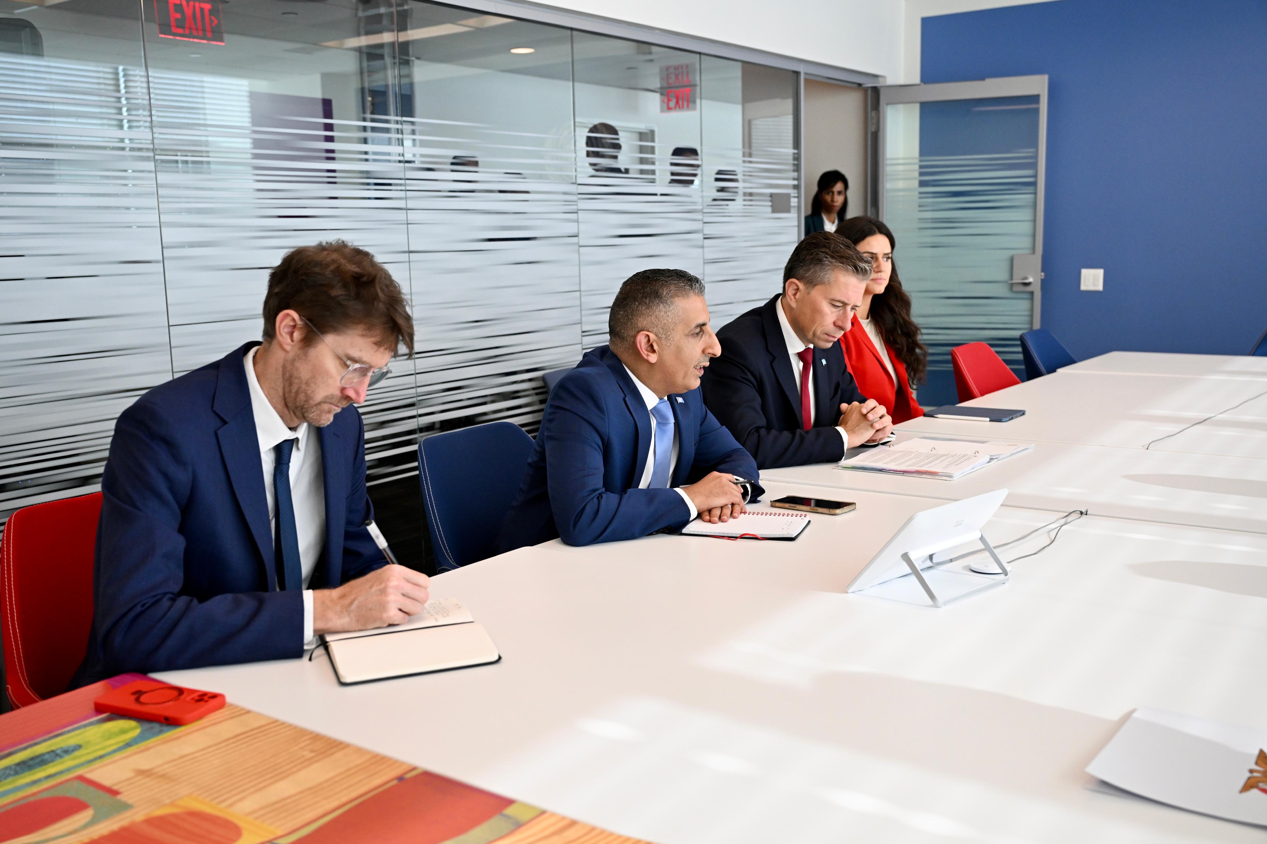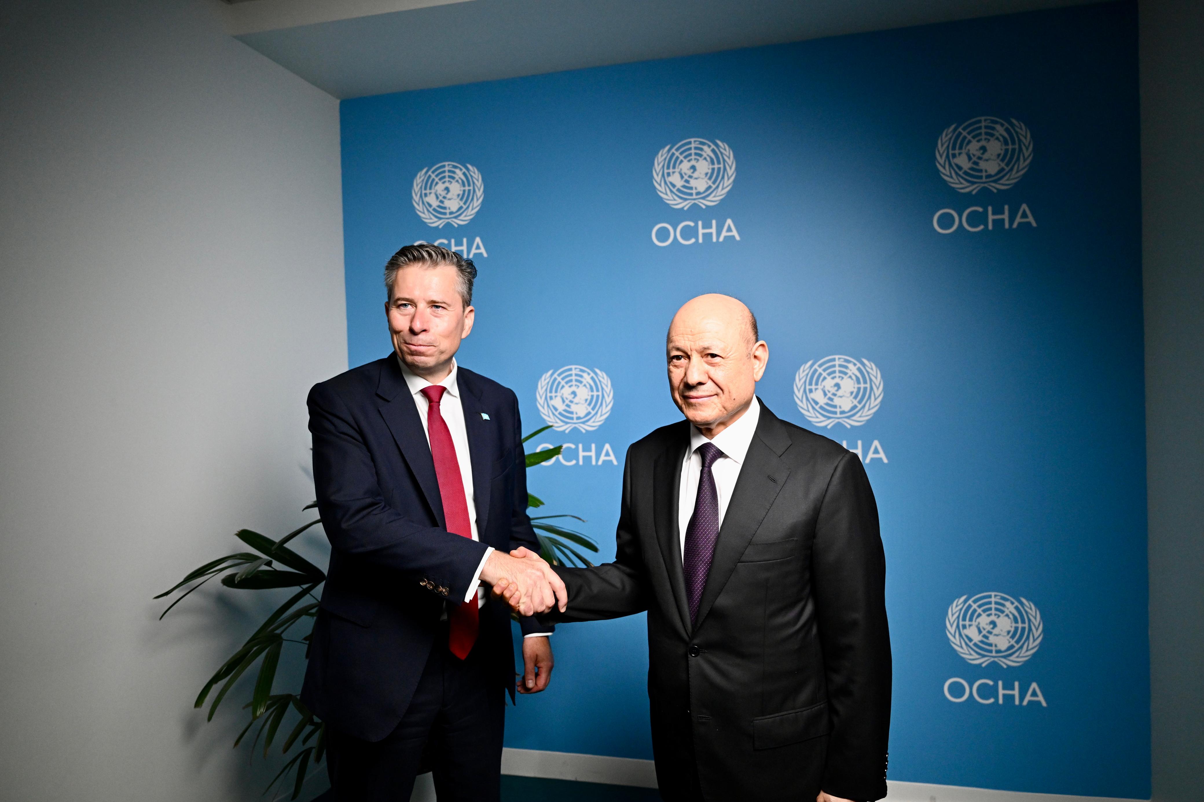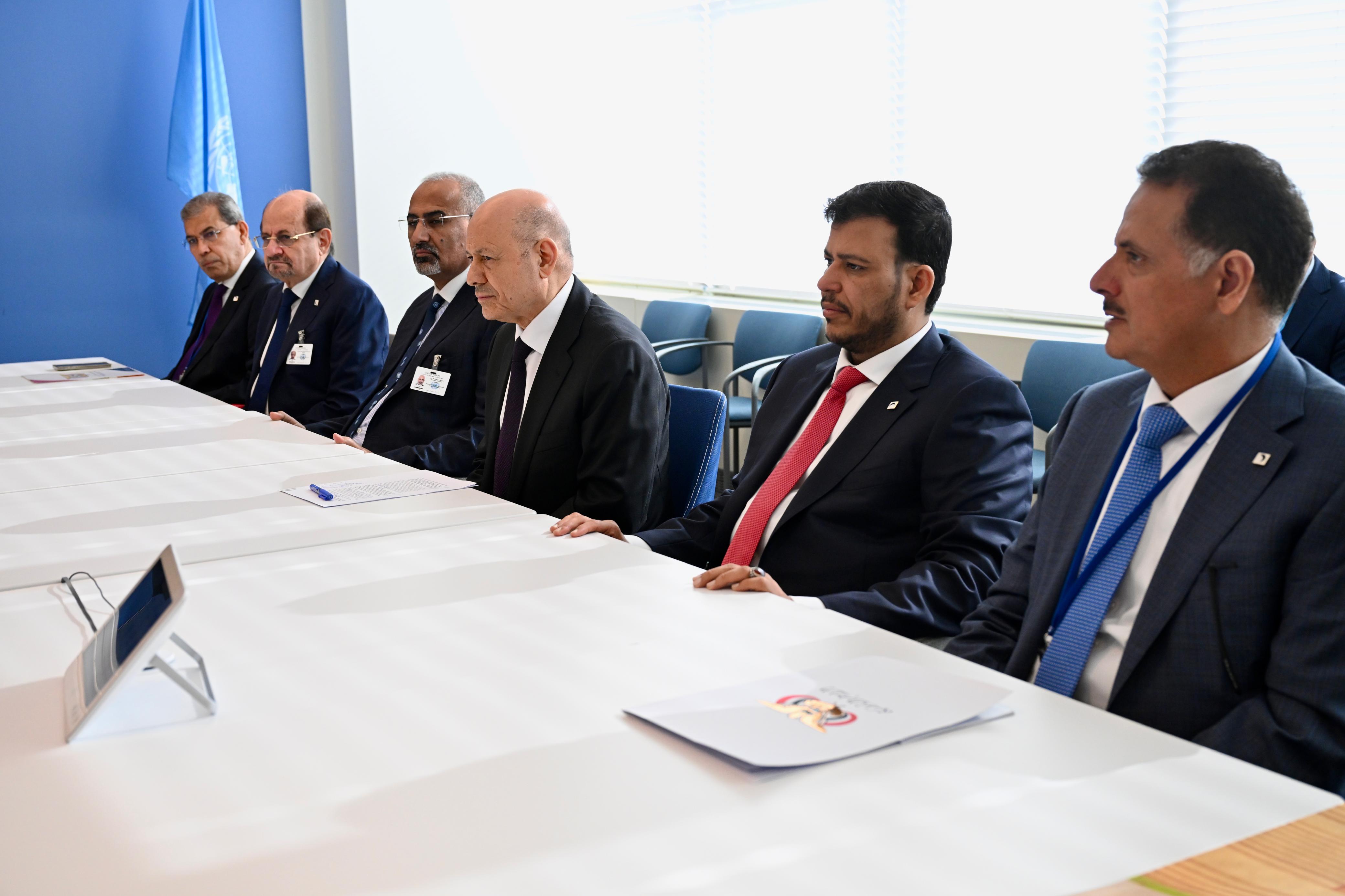 Chairman of the Presidential Leadership Council Dr.Rashad al-Alimi, along with Council members Major General Aidaroos al-Zubaidi and Dr. Abdullah al-Alimi, met Friday with the Under-Secretary-General of the United Nations for Humanitarian Affairs and Emergency Relief Coordinator Tom Fletcher on the sidelines of the meetings of the eightieth session of the United Nations General Assembly.