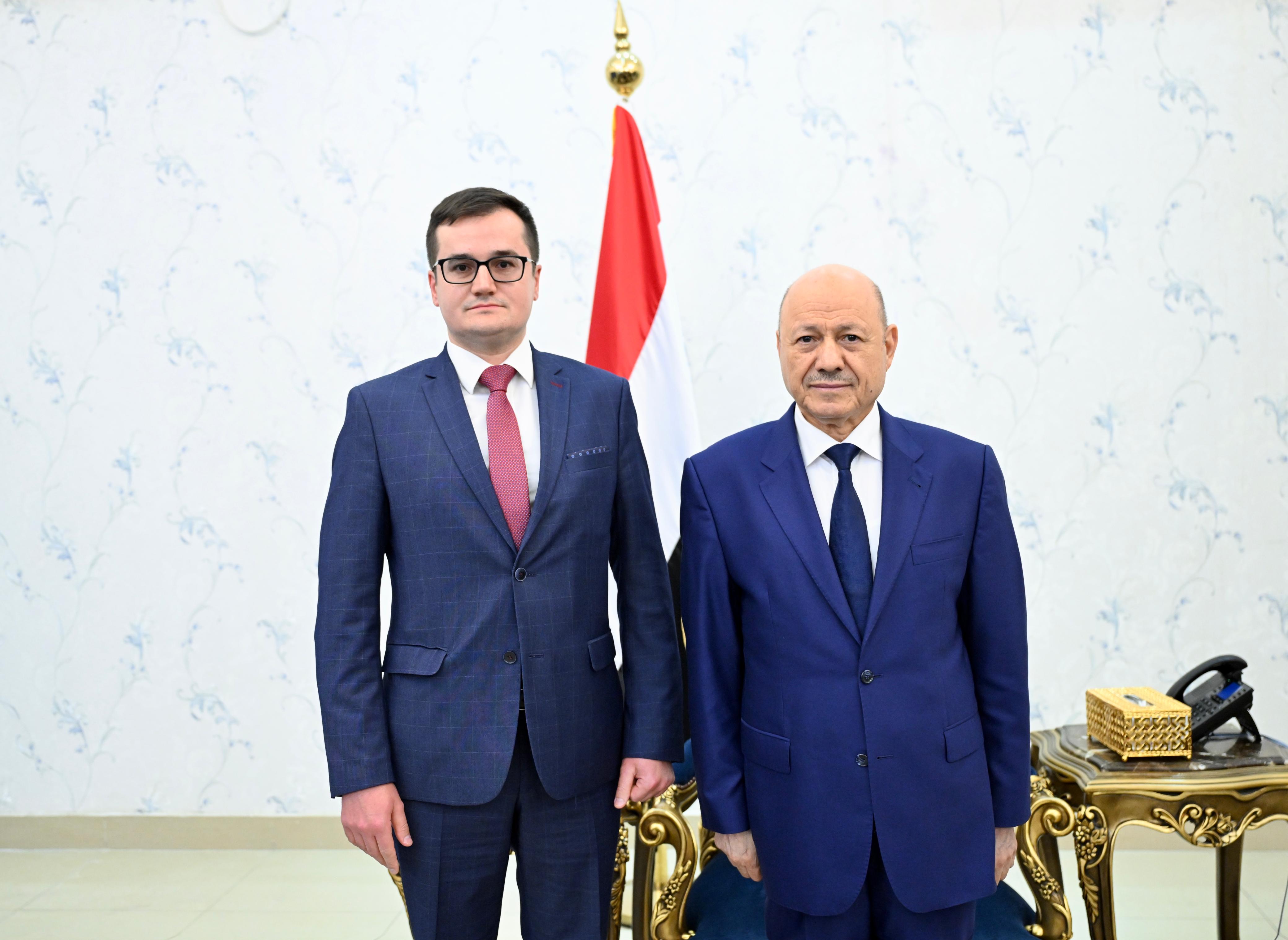 تسلم فخامة الرئيس الدكتور رشاد محمد العليمي، رئيس مجلس القيادة الرئاسي، اليوم الخميس، بقصر معاشيق في العاصمة المؤقتة عدن، اوراق اعتماد سفير جمهورية روسيا الاتحادية لدى اليمن يفغيني كودروف.