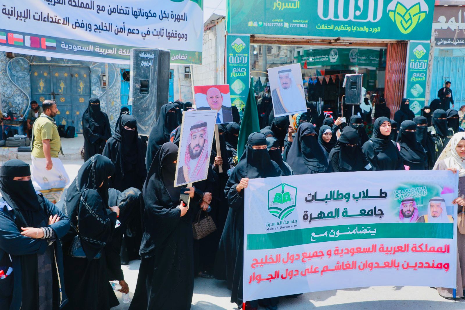 ورفع المشاركون في المسيرة، التي شارك فيها قيادات سياسية وشخصيات اجتماعية وممثلون عن منظمات المجتمع المدني وقطاعا المرأة والشباب، إلى جانب حشد كبير من المواطنين، أعلام الجمهورية اليمنية والمملكة العربية السعودية، ولافتات تضامنية عبّرت عن دعمهم الثابت للسعودية ودول الخليج والدول العربية.