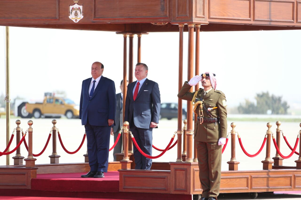 وبعد السلام على كبار الضيوف المستقبلين كلاً من امين عام جامعة الدول العربية الدكتور احمد ابو الغيط ودولة رئيس الوزراء الاردني الدكتور هاني الملقي ورئيس الديوان الملكي الهاشمي الدكتور فايز الطراونه ووزير الخارجية وشئون المغتربين ايمن الصفدي ومدير مكتب جلالة الملك عبدالله الثاني الدكتور جعفر حسان ووزير الاعلام الدكتور محمد المومني ،ونائب رئيس الوزراء وزير الخارجية عبدالملك المخلافي ورئيس واعضاء بعثة الشرف ومندوب بلادنا الدائم لدى الجامعة العربية السفير رياض العكبري وسفير بلادنا لدى الاردن علي العمراني واعضاء بعثة السفارة ، توجه فخامة الرئيس واخيه الملك عبدالله الثاني الى منصة الشرف حيث اجريت مراسم عزف السلام الوطني لبلادنا.