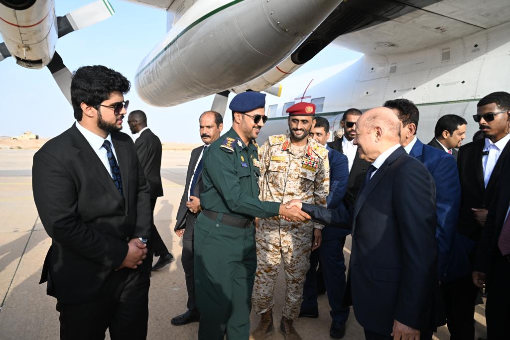 The Governor of Almahra Mohammed Ali Yasser along with the Secretary General of the Republic Presidency Yasser Ashaqi, a number of Parliament and Shura Council members and senior military and security officials received the Chairman of the Presidential Leadership Council at al-Ghaida airport.