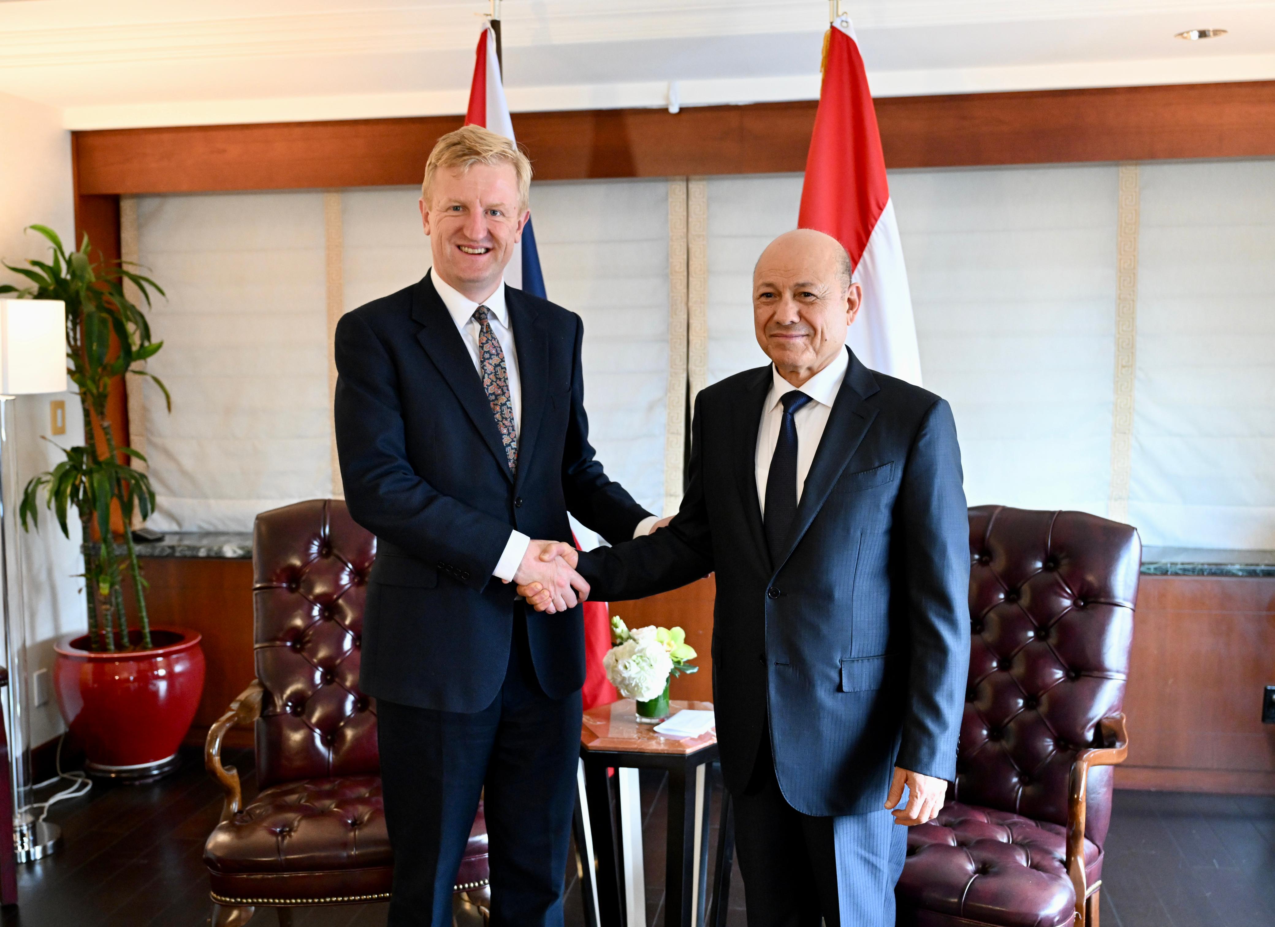 President Dr. Rashad Mohammed Al-Alimi, Chairman of the Presidential Leadership Council along with Council member Aidaroos Al-Zubaidi, received today, Friday, at his residence in New York, the Deputy Prime Minister of the United Kingdom, Oliver Dowden, on the sidelines of the discussions of the seventy-eighth session of the United Nations General Assembly.