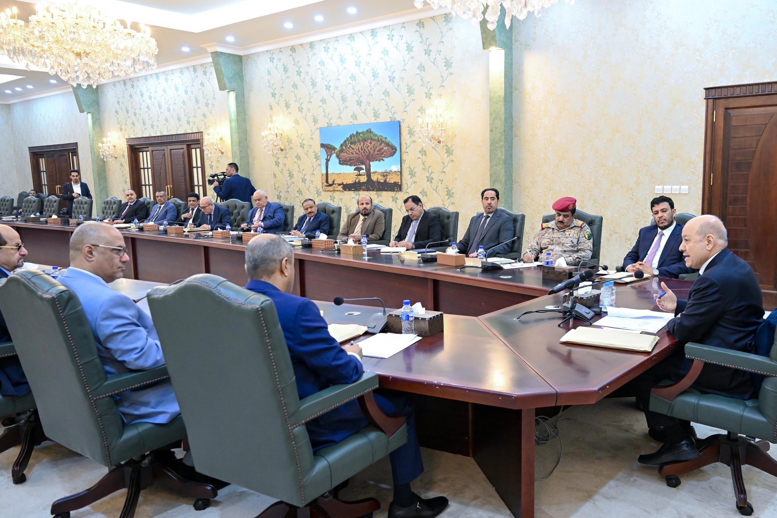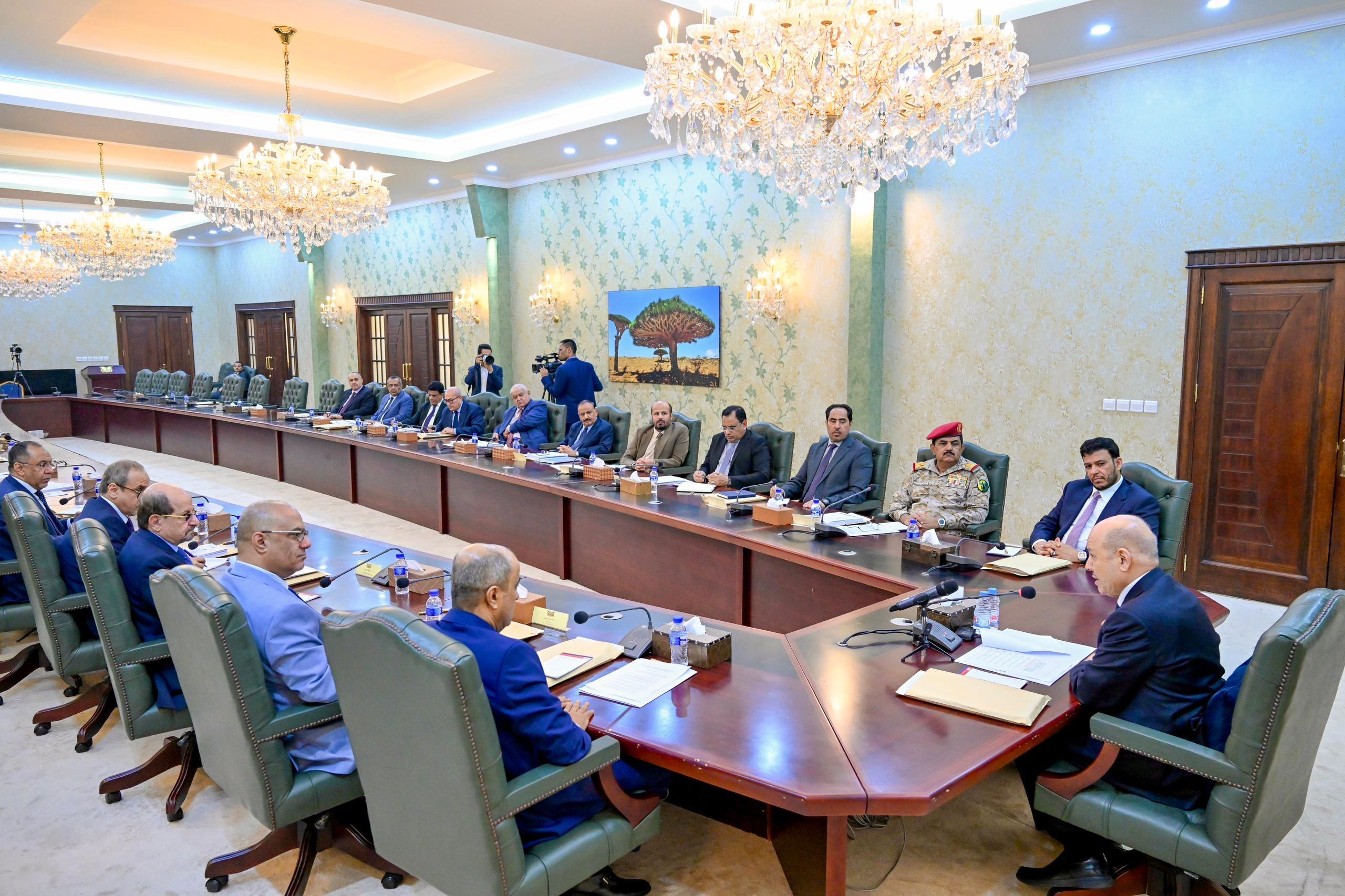 His Excellency President Dr. Rashad Mohammed al-Alimi, the Chairman of the Presidential Leadership Council, together with Council member Dr. Abdullah al-Alimi Bawazir, chaired part of a government meeting on Sunday at the Ma’ashiq Palace in the presence of Prime Minister Salem Saleh bin Buraik.