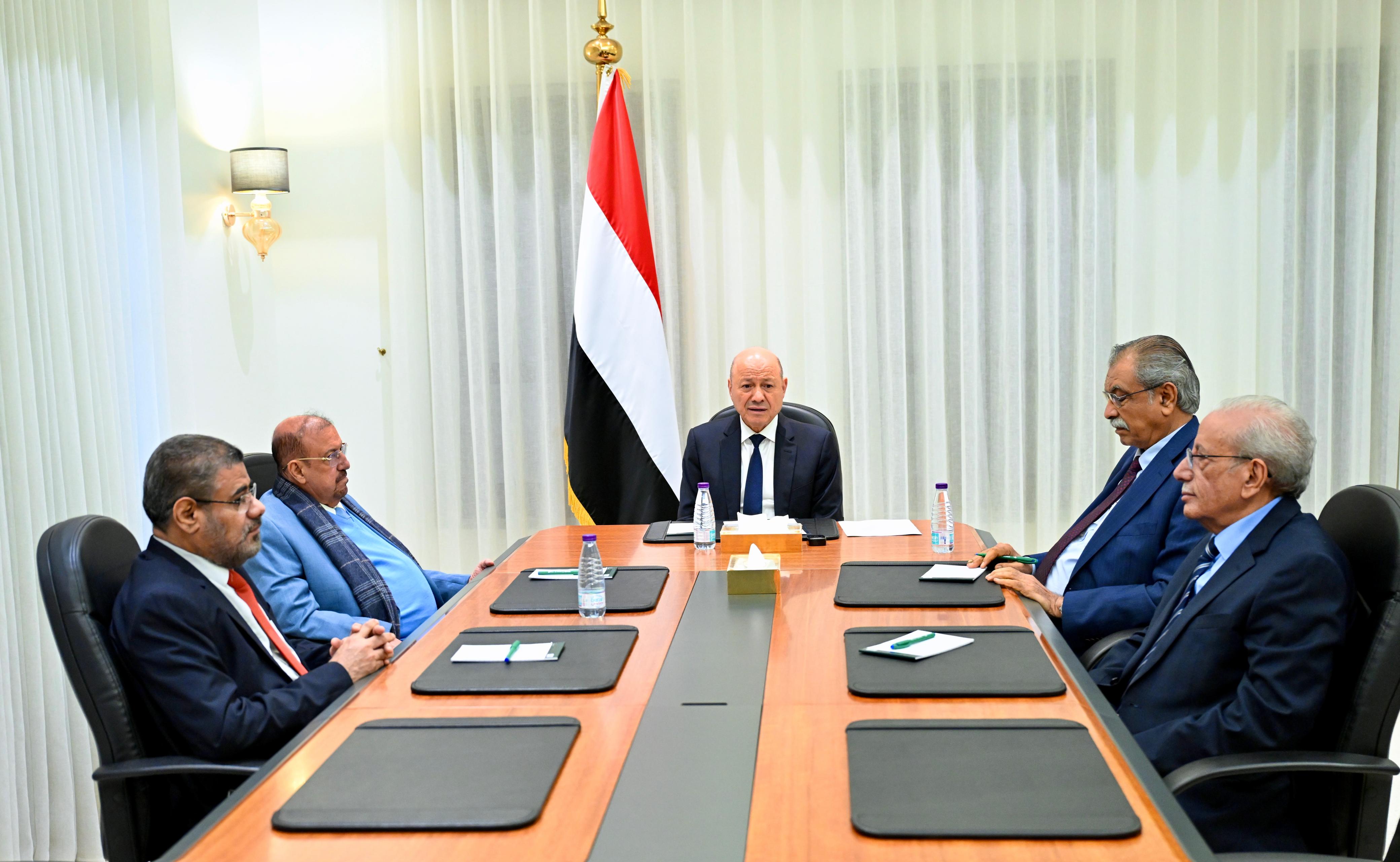 His Excellency President Dr. Rashad al-Alimi, the Chairman of the Presidential Leadership Council, met Thursday with the Speaker of the Parliament Sheikh Sultan al-Barakani and members of the Parliament,s Presidency Mohammed al-Shaddadi and Mohsen Basurah to consult on national developments.