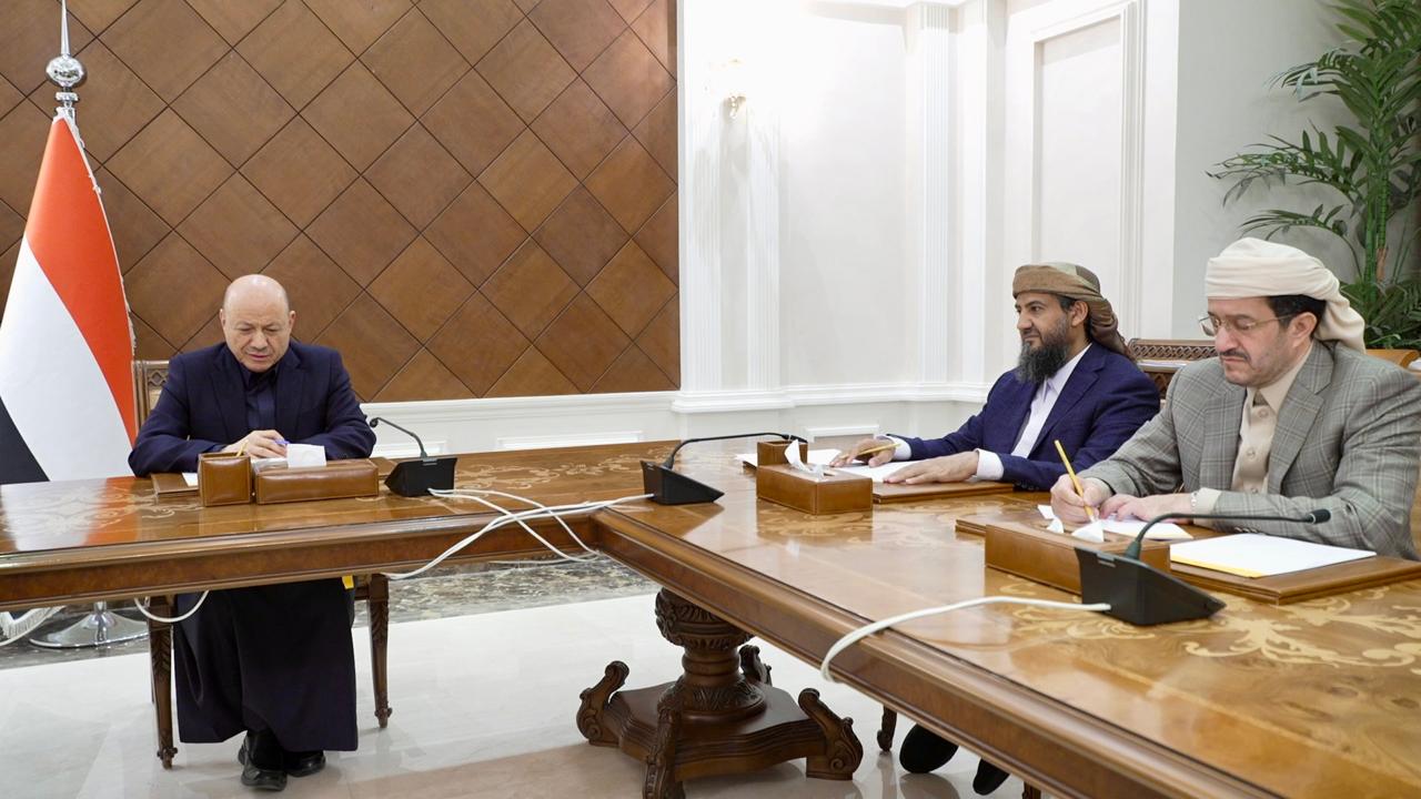 The Presidential Leadership Council (PLC) held an emergency meeting today, Wednesday, chaired by His Excellency President Dr. Rashad al-Alimi, Chairman of the Council, with the presence of its members Sultan al-Arada, Tariq Saleh, Abdulrahman al-Mahrami, Dr. Abdullah Al-Alimi and Othman Majli.