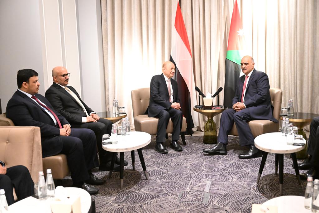His Excellency President Dr. Rashad al-Alimi, Chairman of the Presidential Leadership Council, along with the Council's members Tariq Saleh and Dr. Abdullah al-Alimi held talks today, Monday, with Jordanian Prime Minister Bisher al-Khaswneh.