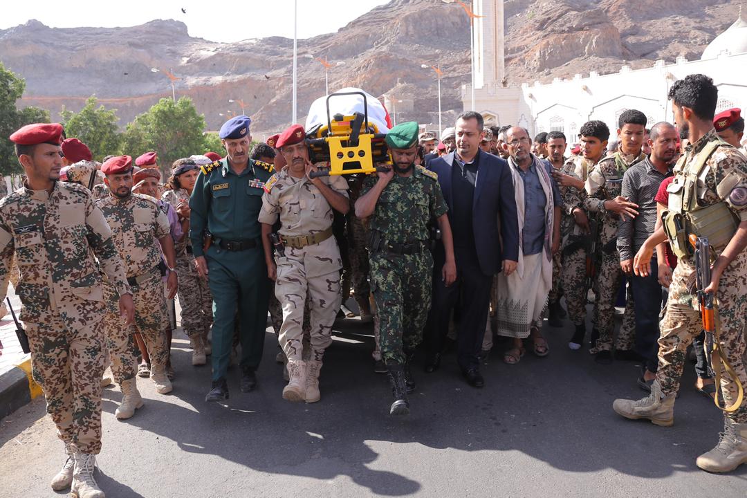 رئيس الوزراء وقيادات الدولة يؤدون صلاة الجنازة على الشهيد طماح في عدن